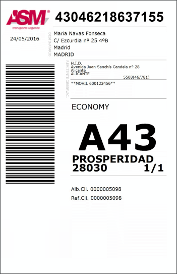 El paquete será entregado en el domicilio designado en el momento del pedido o en la franquicia de ASM más cercana al domicilio. En función del servicio contratado podrá recibir el paquete al dia siguiente antes de las 14:00 (para pedidos hechos antes de las 16:00) o hasta 72 horas para el servicio mas economico